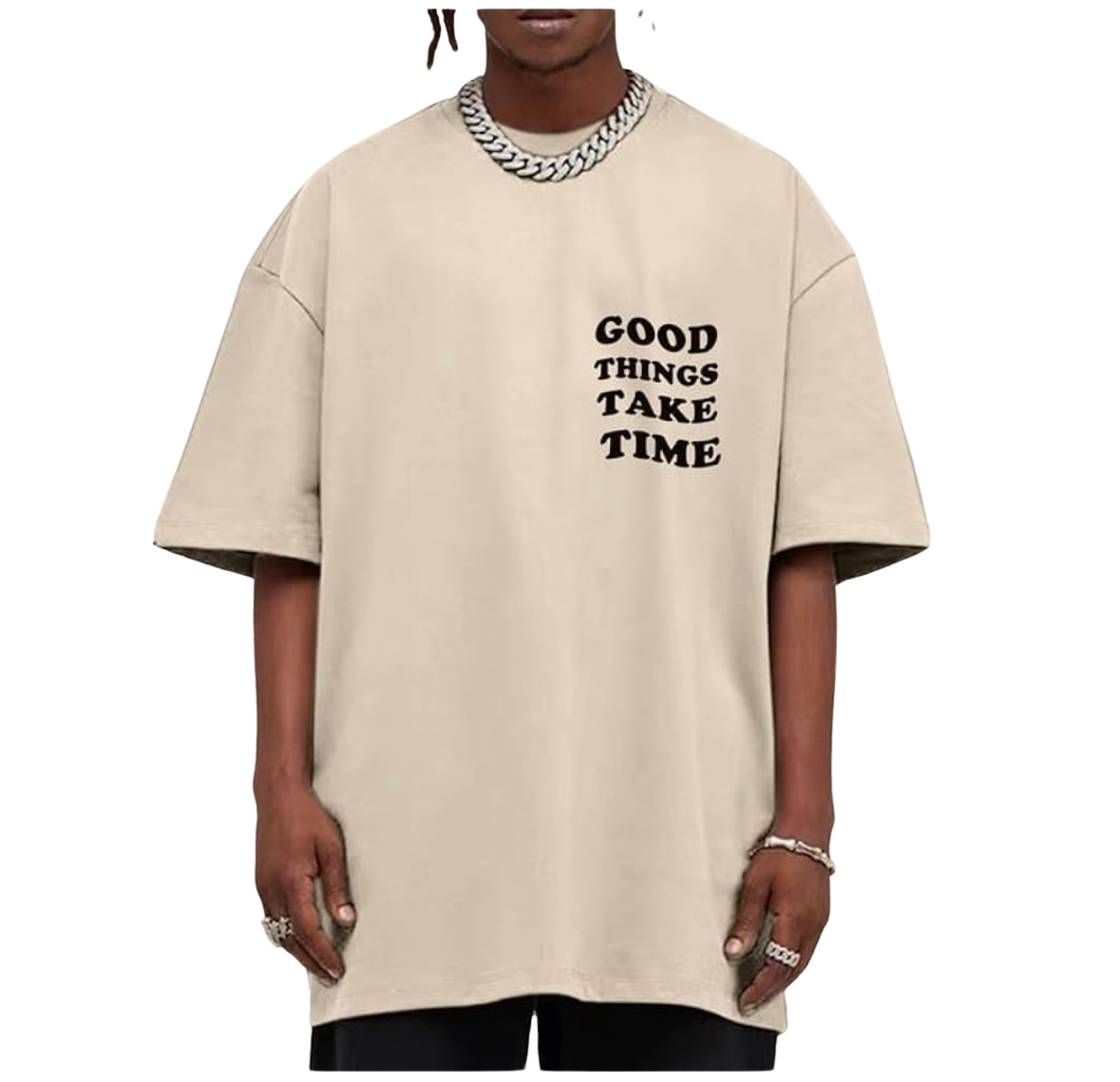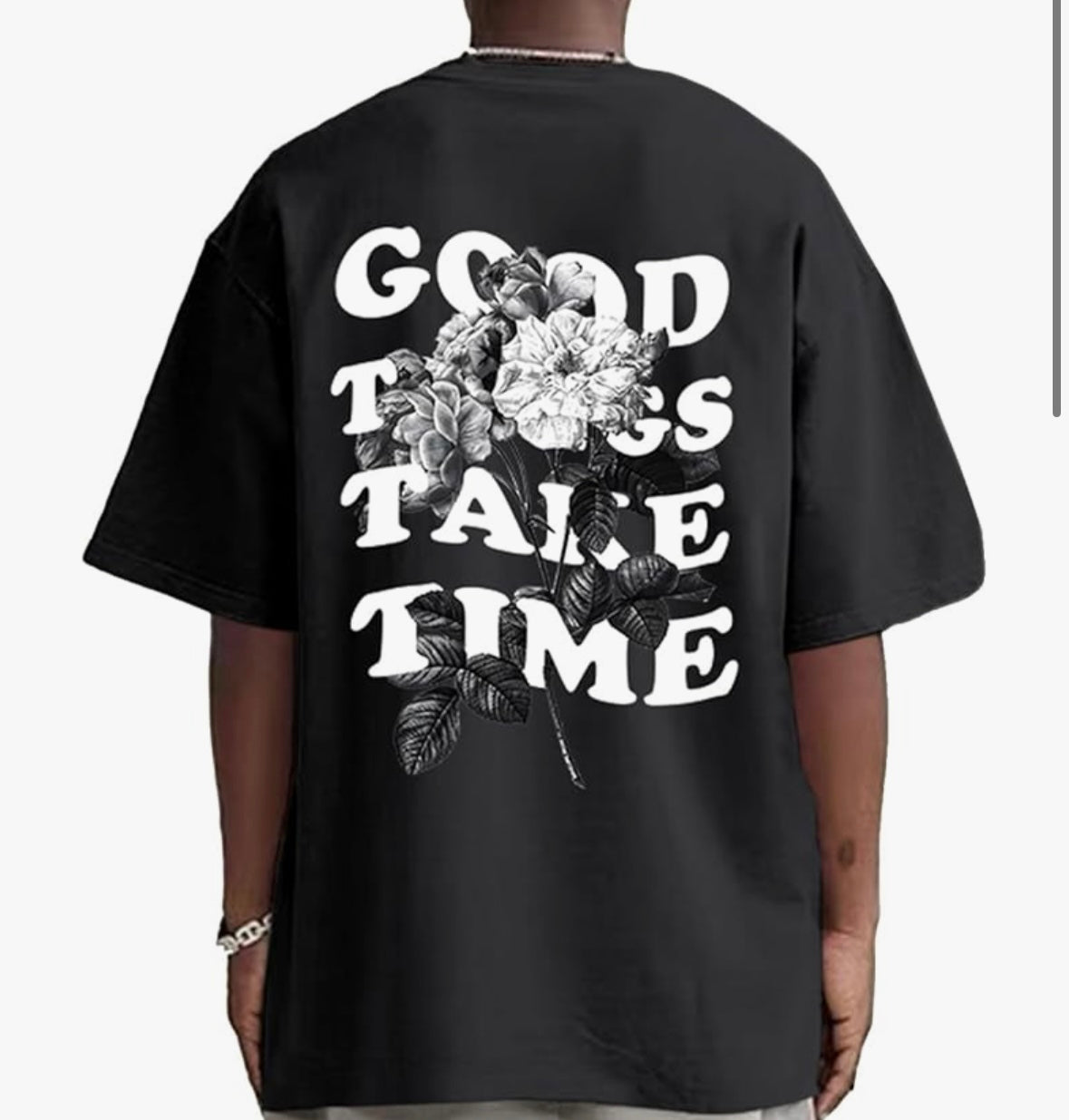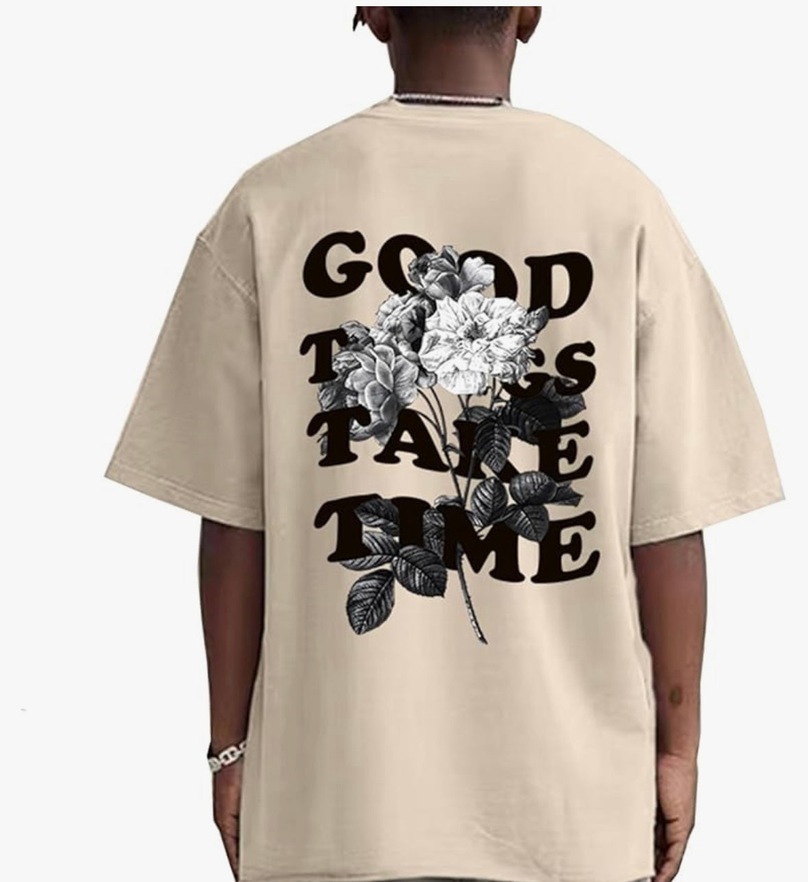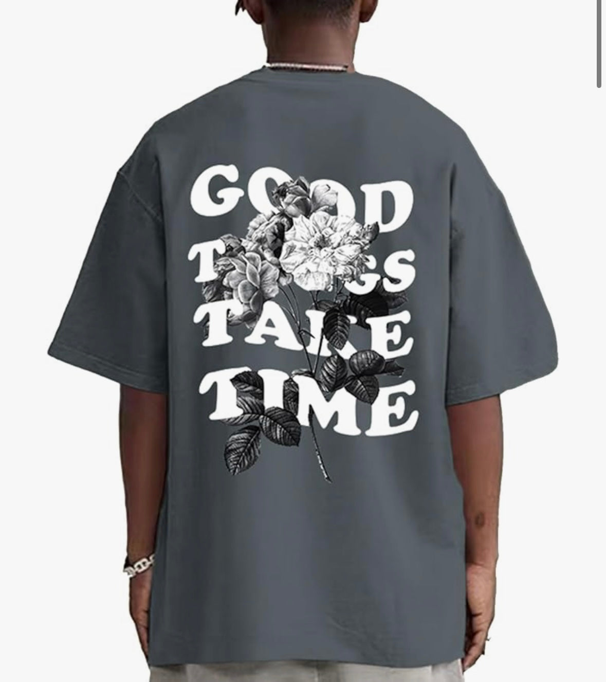Men graphic t shirt, half sleeve, round neck, drop shoulder, Good Things Take Time, letter printing on the front and letter flower design on the back.
